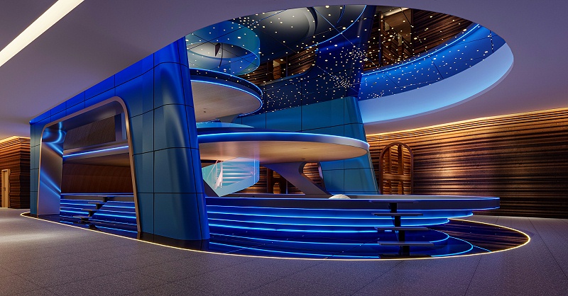 躺空间设计分为两块,动躺萤火水廊、潮人阁、游轮躺等空间,可以体验科技与艺术的融合。静躺是为顾客提供放松、小憩或过夜的舒适场所。以半封闭或独立的小隔间为主,保障私密性。搭配柔和的暖色调灯光营造多元化松弛感,打造多种风格元素的休憩空间。