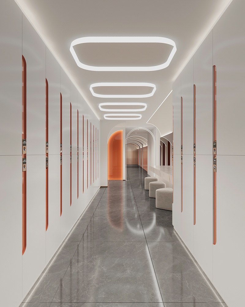 汤泉空间设计项目处于地下空间,为了避免整体给人带来压抑感,采用部分天花镂空手法拉伸空间层次,墙面以白色为主,搭配暖色系的橘色结合灯光效果,使空间呈现出一种清新、明亮且充满活力的感觉。