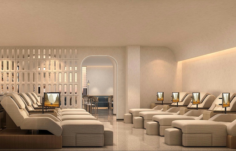 汤泉空间设计中原木元素的天然纹理与温润触感营造舒缓氛围,局部低饱和色彩活跃空间。地面采用水磨石,与原木形成冷暖碰撞,提升空间层次感。隐藏式暖光灯带营造柔和间接光。通过简洁的造型、温润的光线和流畅的动线,使人享受沉浸式的疗愈体验。