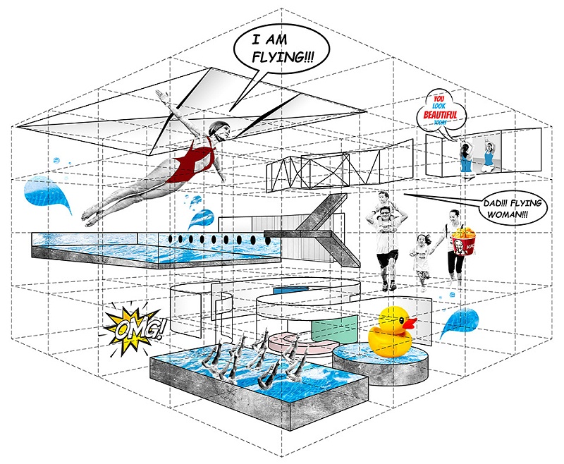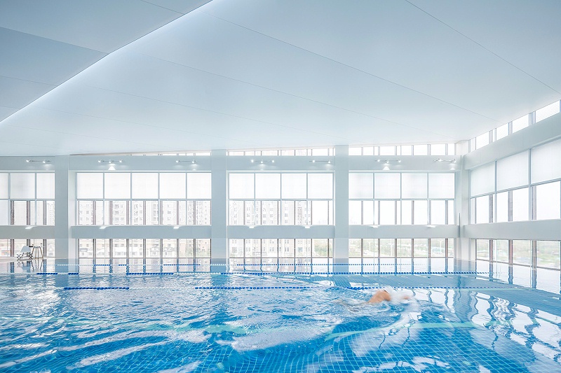 将成人标准泳池设置在三层南侧的通高空间内。在泳池上空,让白色软膜吊顶靠近玻璃幕墙的两边微微翘起,形成自然光缝;通过几何的褶皱令吊顶中央裂出两道人工光缝。它们使泳池上部空间产生起伏、动感的效果。