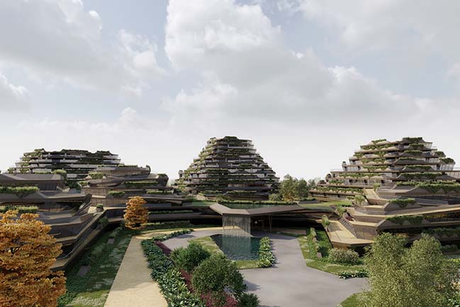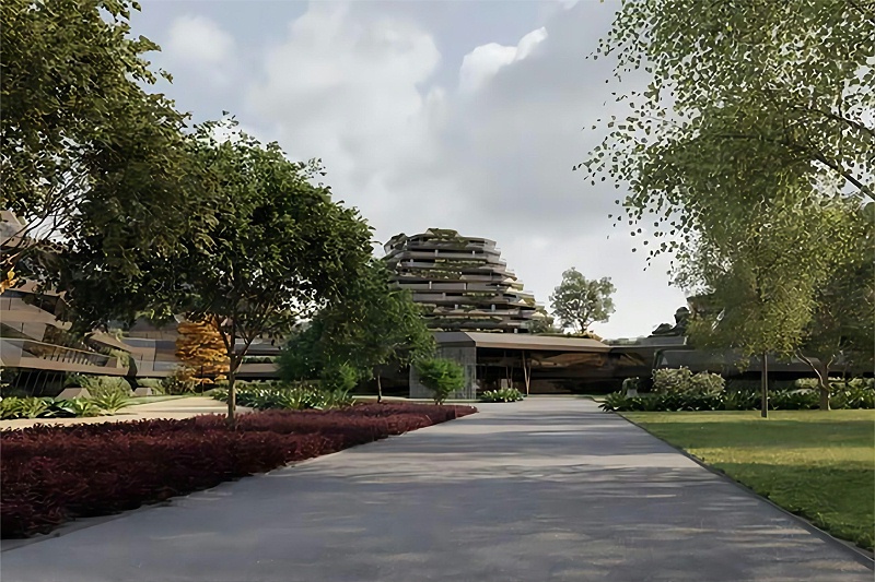 由于有螺旋形的露台,中央建筑可以一直通到覆盖着开发区部分的屋顶,该开发区设有外部游泳池,历史寺庙的景色让人联想到中国传统浴场的感觉。在健康中心发展的第二阶段,现有建筑的替换将形成与对面环境相同的遮蔽物,完全包围土丘和寺庙,并重申其在综合体中心的位置。