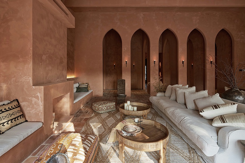 SPA馆内部空间设计整体以暗红色为基本色,这是一种常见于摩洛哥和中东地区住宅外墙的颜色,设计师试图借此打造一个富有异域色彩的室内空间。墙面使用暗红色系的艺术涂料。地面铺以定制的复古手工地砖,采用与墙面相协调的颜色。形成了一个富有多重含义的暧色系空间。
