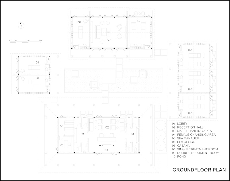 水疗中心的两个主要建筑物,包含了前台接待区、更衣室、淋浴室和水疗室等。还有两个附属建筑物,它们内部只有水疗室。每个水疗室的房间后面都有自己的私人露台,露台会连着一小片花园。景观设计也追随着度假村的精神理念,在花园里使用了当地的植物花卉。唯一的例外是景观池塘里种植的鸡蛋花,鸡蛋花代表了新的开始和对于平和的期盼。