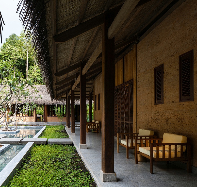 这个项目的特点是夯土墙的使用,这也同时是对度假村里之前建造的平房小屋的继承和延续。这些厚实的夯土墙,结合着向外延伸的屋檐和木制百叶门/窗,打造了一个通风舒适的室内空间,也因此,室内不需要安装空调。可以沿轴转动开合的木制百叶门/窗能够根据不同时刻的氛围和不同客人的心情帮助控制进入室内空间的自然光的量。