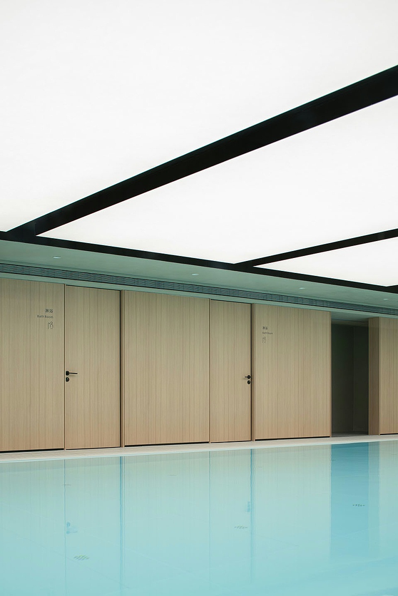 游泳馆的观课区以灰色水磨石铺地,与内部空间暖白色的柔性灯膜形成对比,让内部空间看起来温暖明亮。曲面玻璃搭配原木色吧台,简而不凡,高脚椅与天花的深色元素点缀整体空间。