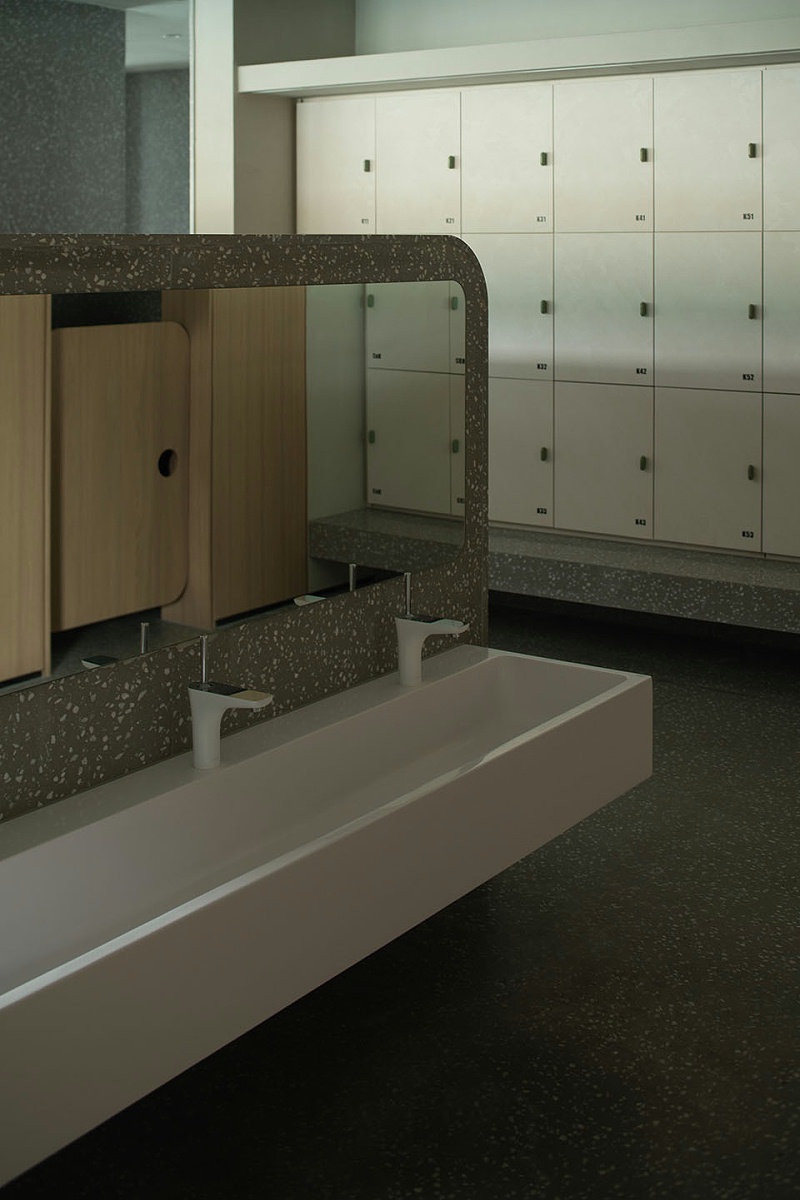 儿童淋浴区设置了适合小朋友身高的洗手池,儿童独立淋浴房设置了高矮合适的半个隔断在保护儿童隐私的情况下保证了监护人的视野。