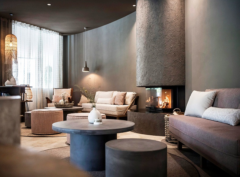 水疗中心 连通室内外的游泳池顺着杂草丛生的绿色外墙向室外延伸。框架在水池与周围开放空间的交接处消融,从视觉上与景观形成了没有边际的连接。一个由天然石材制成的中央饮水喷泉,带开放式壁炉的宽敞休息区可直接通往淋浴、更衣、美容和按摩室。芬兰桑拿浴室可以唤醒宾客的多重感官,被波浪状木板条环绕的宽大玻璃窗,蒸汽浴室就像一个洞穴,水滴顺着向房顶倾斜的天花板滴落在陶制集水罐中。
