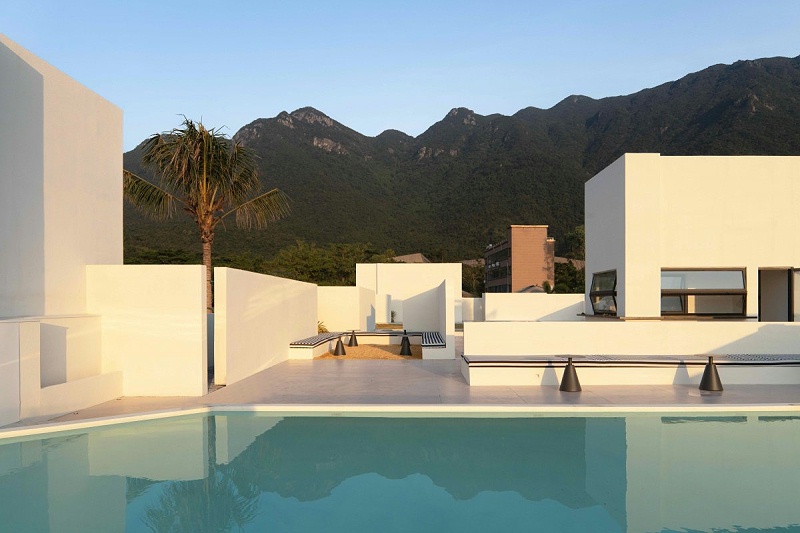 亿伽设计为您分享汤泉泡池酒店设计,白色的矩阵建筑群体,结构层层迭迭,将酒店和自然完美结合,赋予空间野奢的基调。以庭院中心的圆型景观池破除建筑形体的硬朗,在黑色深邃与白色纯净的碰撞中,形成了酒店的核心区域。